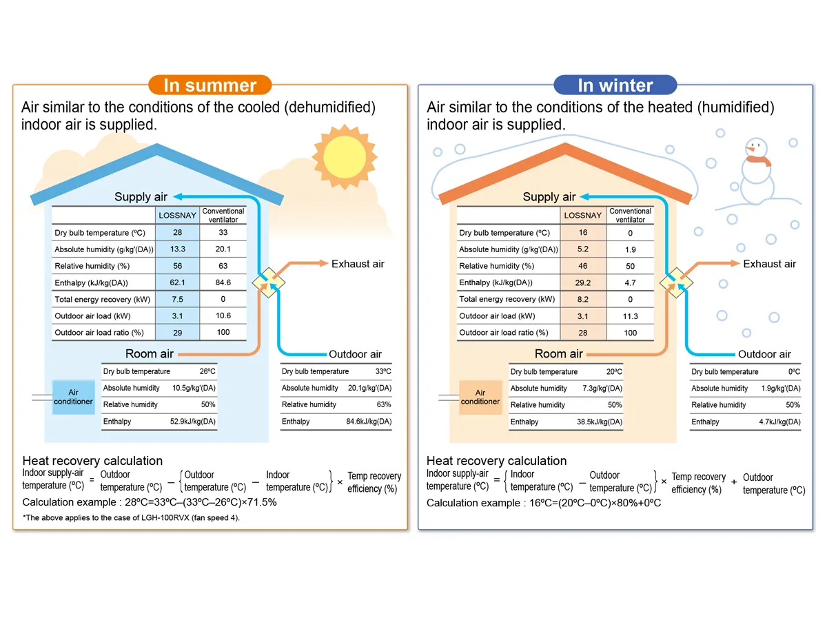 Зимой свежий воздух нагревается и увлажняется за счёт вытяжного, летом — охлаждается и осушается, что исключает необходимость использования дополнительных нагревательных или охлаждающих элементов.